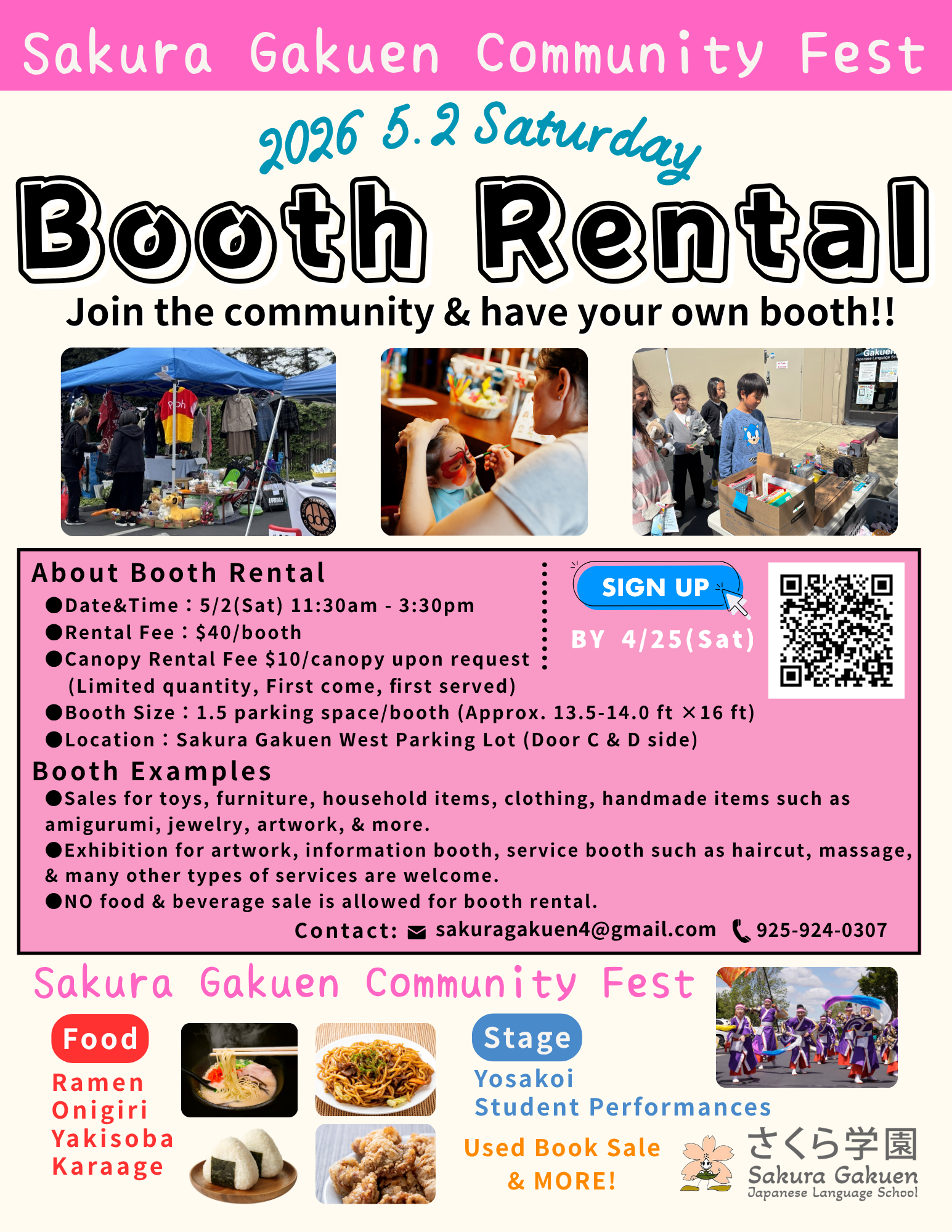 【Booth Rental 】Sakura Gakuen Community Fest さくら学園コミュフェス 5/2/2026 (Sat.) Booth Rental ブースレンタル Sign up by 4/25 (Sat.) Click here to sign up お申し込みはここをクリック