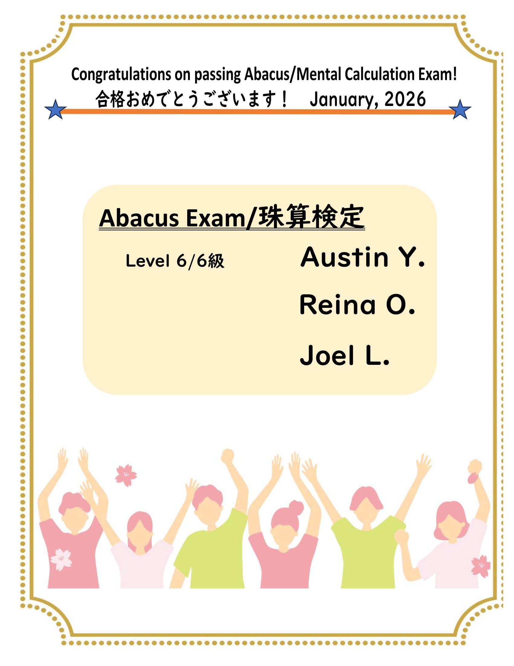 2026 January Abacus/Mental Calculation Exam Result 2026年1月珠算・暗算検定結果