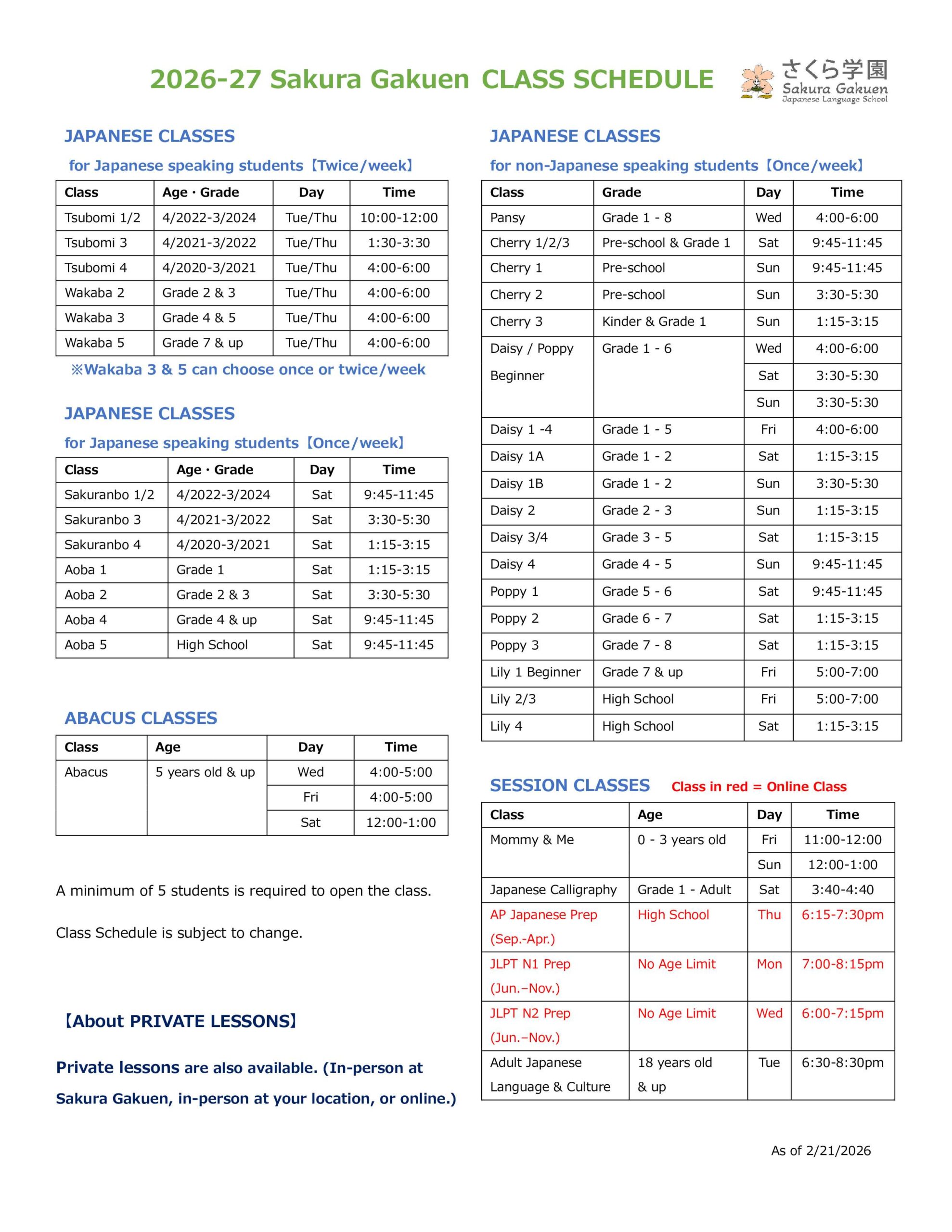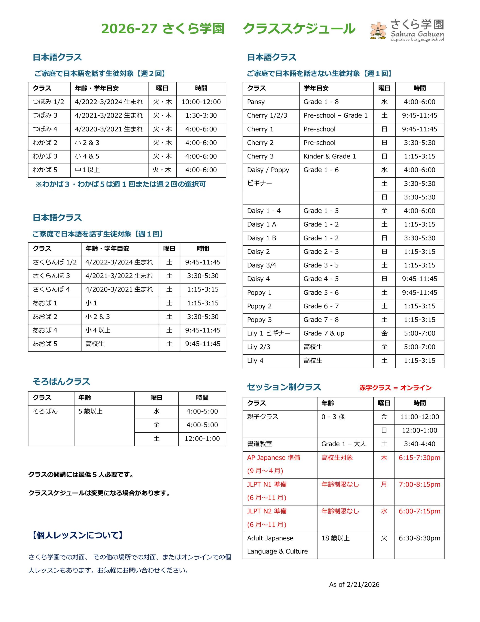 • 2026-27 School Year Registration & Class Schedule新学期登録 & クラススケジュール (8/2/26 – 6/7/27)