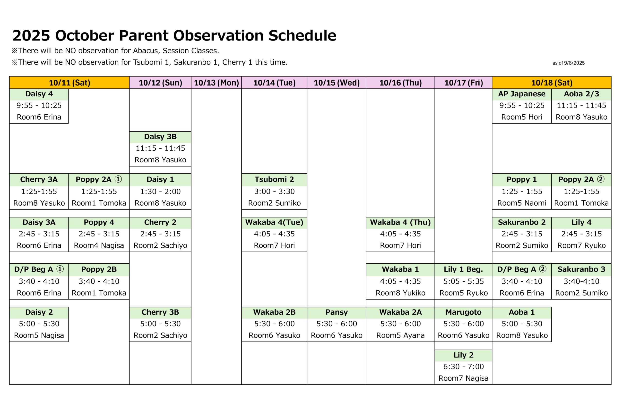 授業参観 Parent Observation 10/11/25(Saturday)-10/18/25(Saturday)